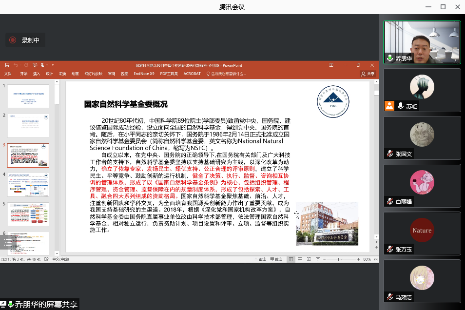 乔朋华教授针对国家自然科学基金申报及研究过程中的科研诚信问题进行了详细介绍,重点强调了申报信息、资金使用、申请机制等方面的关键内容,建议项目申报及研究过程坚持科研诚信,规范开展研究。