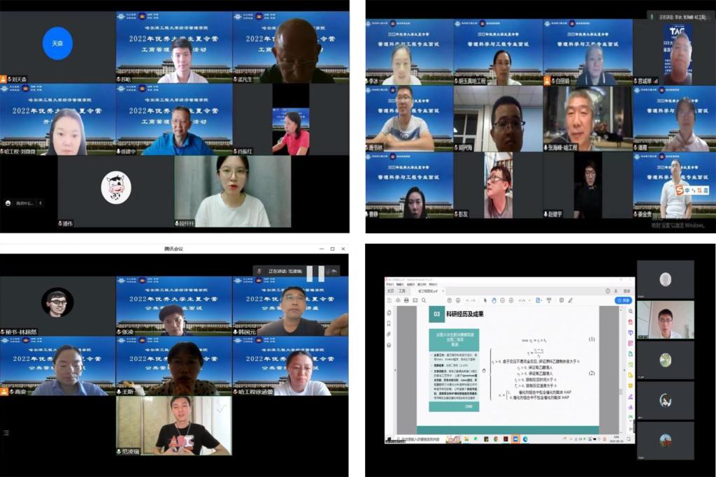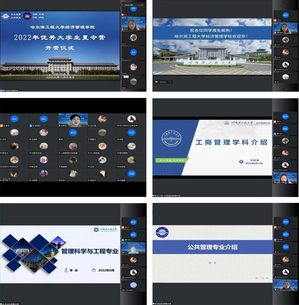 8月15日上午9点,学院通过线上形式举行了2022年优秀大学生夏令营开营仪式,教学副院长李婉红教授、经济学系主任马永红教授、工商管理系主任刘微微教授、管理工程系主任李冰副教授、公共管理系副主任高娈副教授、教师代表、教务办以及入营学生参会。开营仪式上,李婉红教授首先从历史沿革、学科专业设置、学术团队及平台、人才培养成效等方面介绍了学校及学院的相关情况,并代表学院感谢同学们的积极参与。马永红教授、刘微微教授、李冰副教授、高娈副教授分别对应用经济学、工商管理、管理科学与工程、公共管理四个学科进行了详细介绍,并对入营学生表示诚挚欢迎。最后李婉红教授对本次夏令营活动的具体日程安排、综合面试要求等进行了说明。