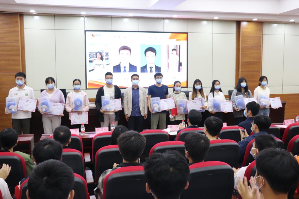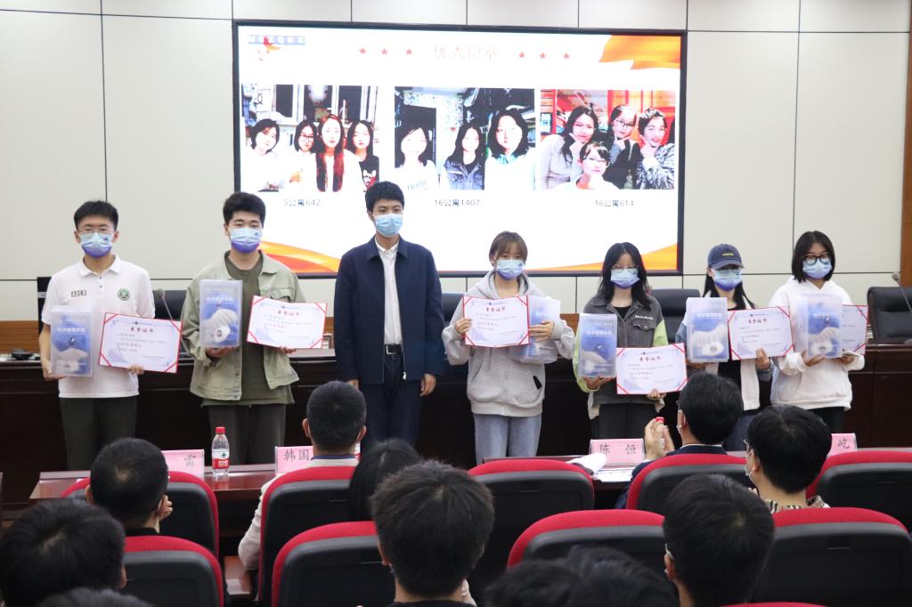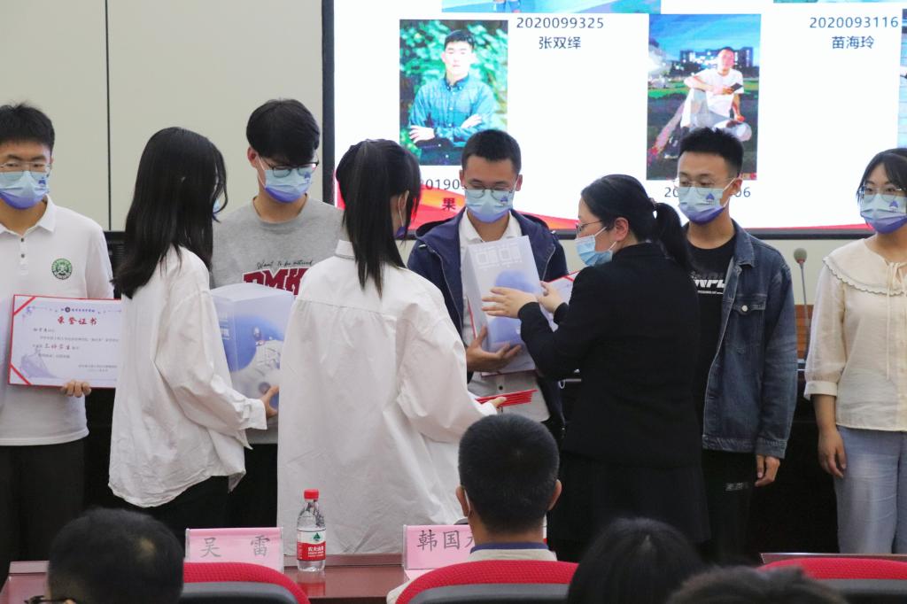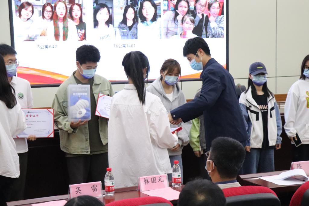 介绍完毕,进行2021-2022年度经管学院“新经英”荣誉奖项的颁发,奖项分别为学习标兵、自强标兵、创新标兵、三好学生、优秀学生干部、三好班级、优秀寝室、满分奖学金、英语六级奖学金,零挂科班级,由各位领导为获奖个体和集体代表人颁奖,颁奖结束后吴雷对获奖学生集体表示鼓励,并借此对新生们提出殷切希望。
