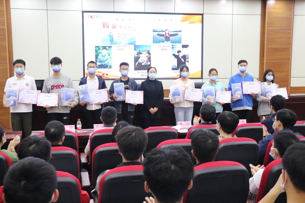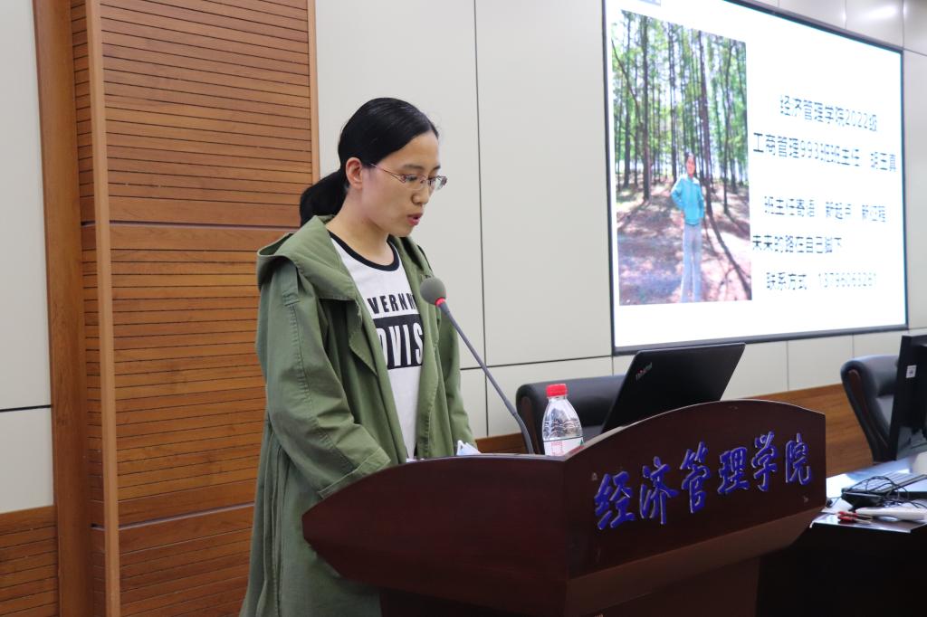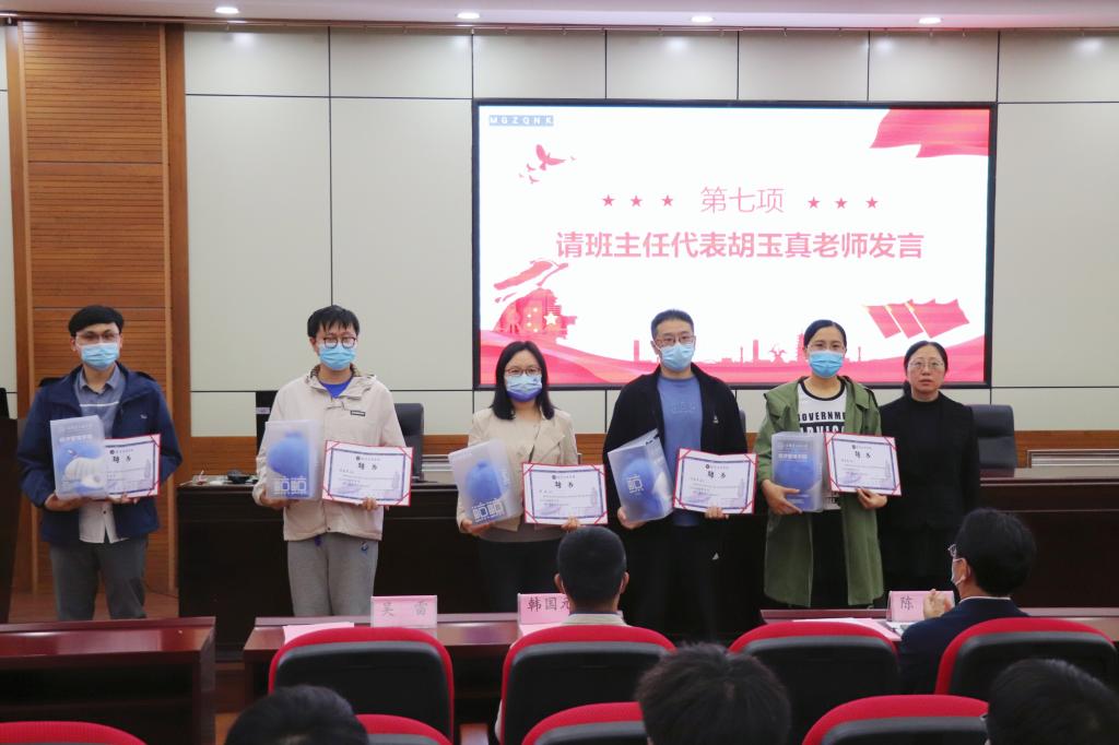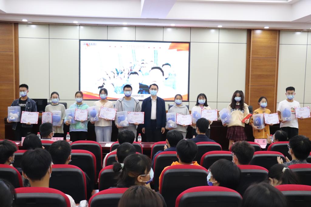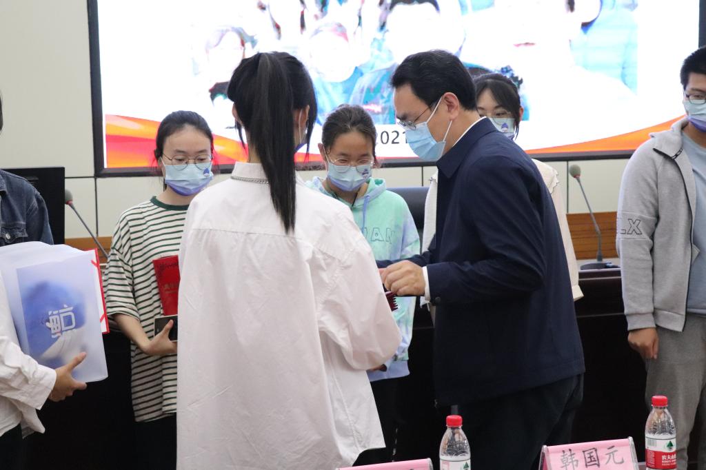 介绍完毕,进行2021-2022年度经管学院“新经英”荣誉奖项的颁发,奖项分别为学习标兵、自强标兵、创新标兵、三好学生、优秀学生干部、三好班级、优秀寝室、满分奖学金、英语六级奖学金,零挂科班级,由各位领导为获奖个体和集体代表人颁奖,颁奖结束后吴雷对获奖学生集体表示鼓励,并借此对新生们提出殷切希望。