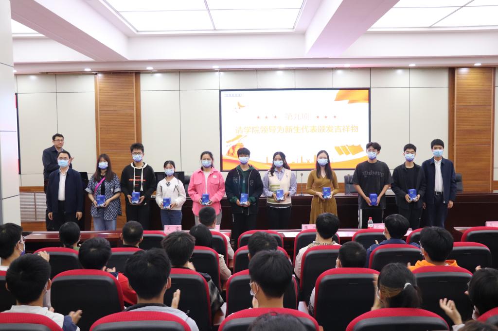 最后,学院领导为新生代表颁发经管学院专属吉祥物“鲸鲸”,表达对新生们快乐成长、享受幸福大学生活的祝愿。此次活动于15时30分结束。