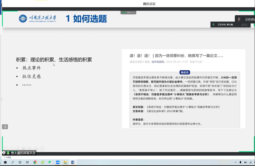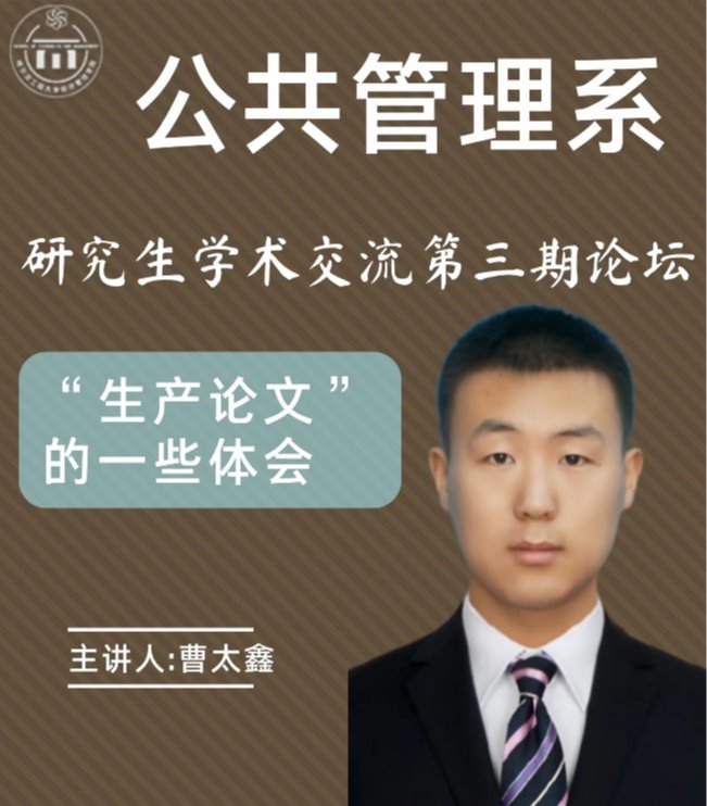 2022年11月25日晚19点,公共管理系举办“研究生学术交流”系列活动第三期论坛。第三期论坛邀请44118太阳成城集团的博士生曹太鑫同学做主题为“‘生产论文’的一些体会”的讲座。活动由高娈老师主持,公共管理专业的2020级和2021级所有研究生及部分老师参加了此次交流活动。