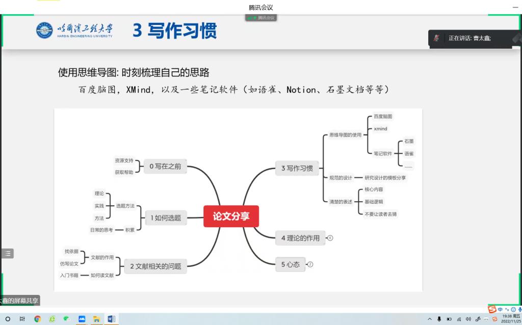 曹太鑫同学结合自己多篇高水平论文的发表经验,从如何选题、文献、写作习惯、写作心态等方面向同学们详细介绍了自己论文撰写过程的一些体会,并给同学们推荐了不同阶段的工具书和使用的辅助工具,建议同学们有意识培养自己的写作习惯,利用思维导图整理自己的撰写思路,形成自己的论文模板。