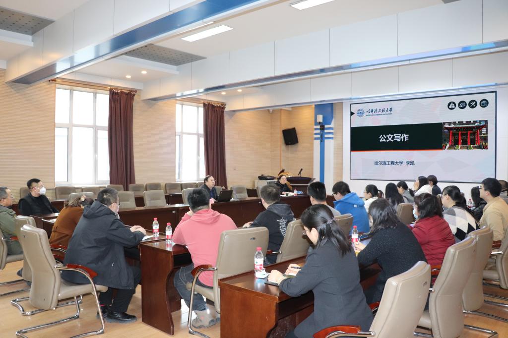 为进一步适应新形势下工作的需要,不断提升学院各职能部门管理人员公文写作水平和技能,2023年3月9日上午,44118太阳成城集团在31号楼312会议室举办了公文写作专题培训讲座,特邀体训部书记李凯主讲,学院职能部门五办三中心(综合办公室、教务办公室、学生工作办公室、科技办公室、学科与专业发展建设办公室、专业学位中心、经济管理实验中心、情报资料中心)共计20余人参加了本次培训。