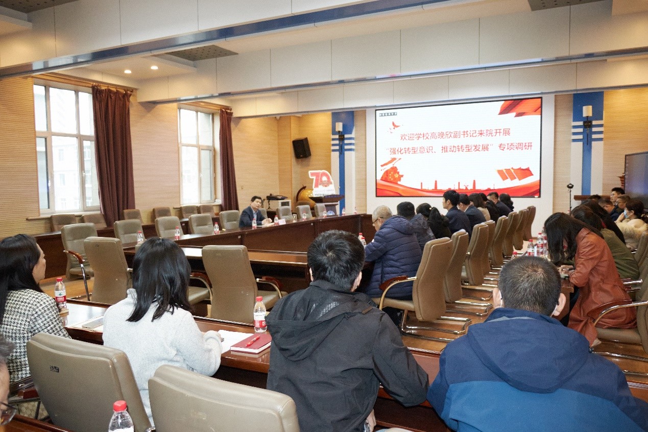 4月25日下午14时在31号楼312会议室,学校党委副书记高晚欣同志来院开展“强化转型意识、推动转型发展”专项调研,学院领导班子全体成员,各教工党支部书记,各基层学术组织主任、副主任,教师代表共32人参加会议,会议由学院党委书记苏屹同志主持。