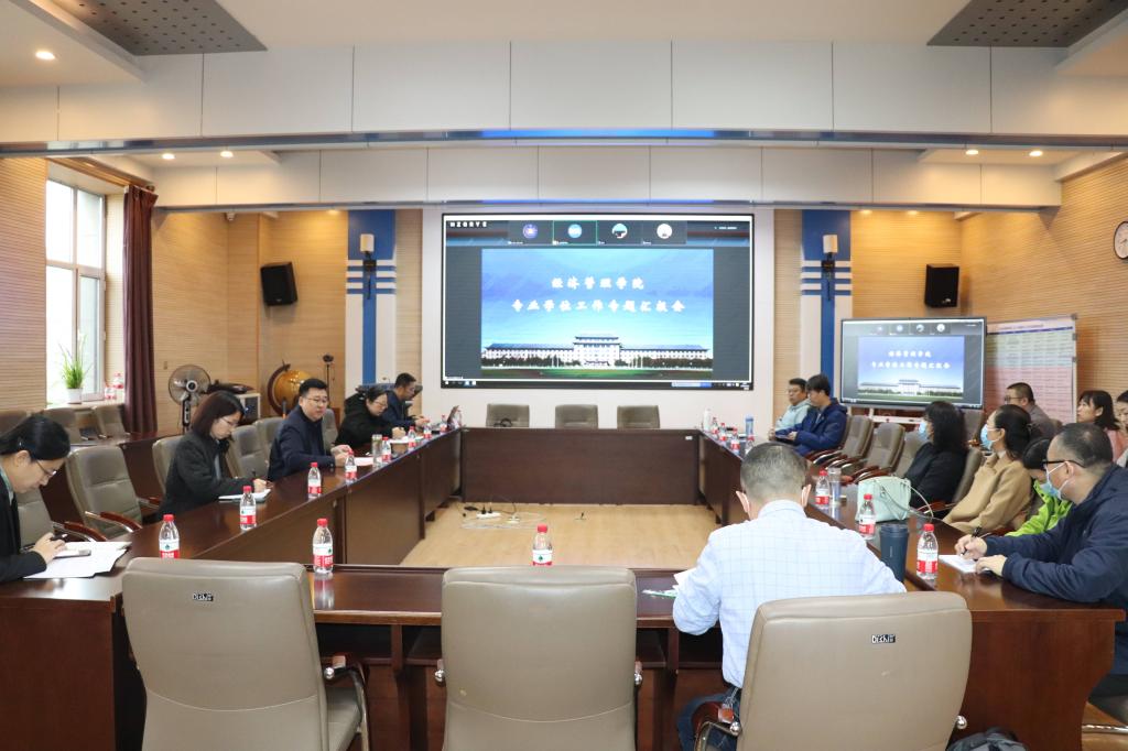 2023年11月3日上午,学院在312会议室召开专业学位工作专题汇报会。院长陈恒、党委书记于云亮、副院长王君、副院长李婉红、院长助理胡玉真、各基层学术组织负责人、党支部书记、各办(中心)主任、专业学位中心全体工作人员参加会议。会议由于云亮书记主持。