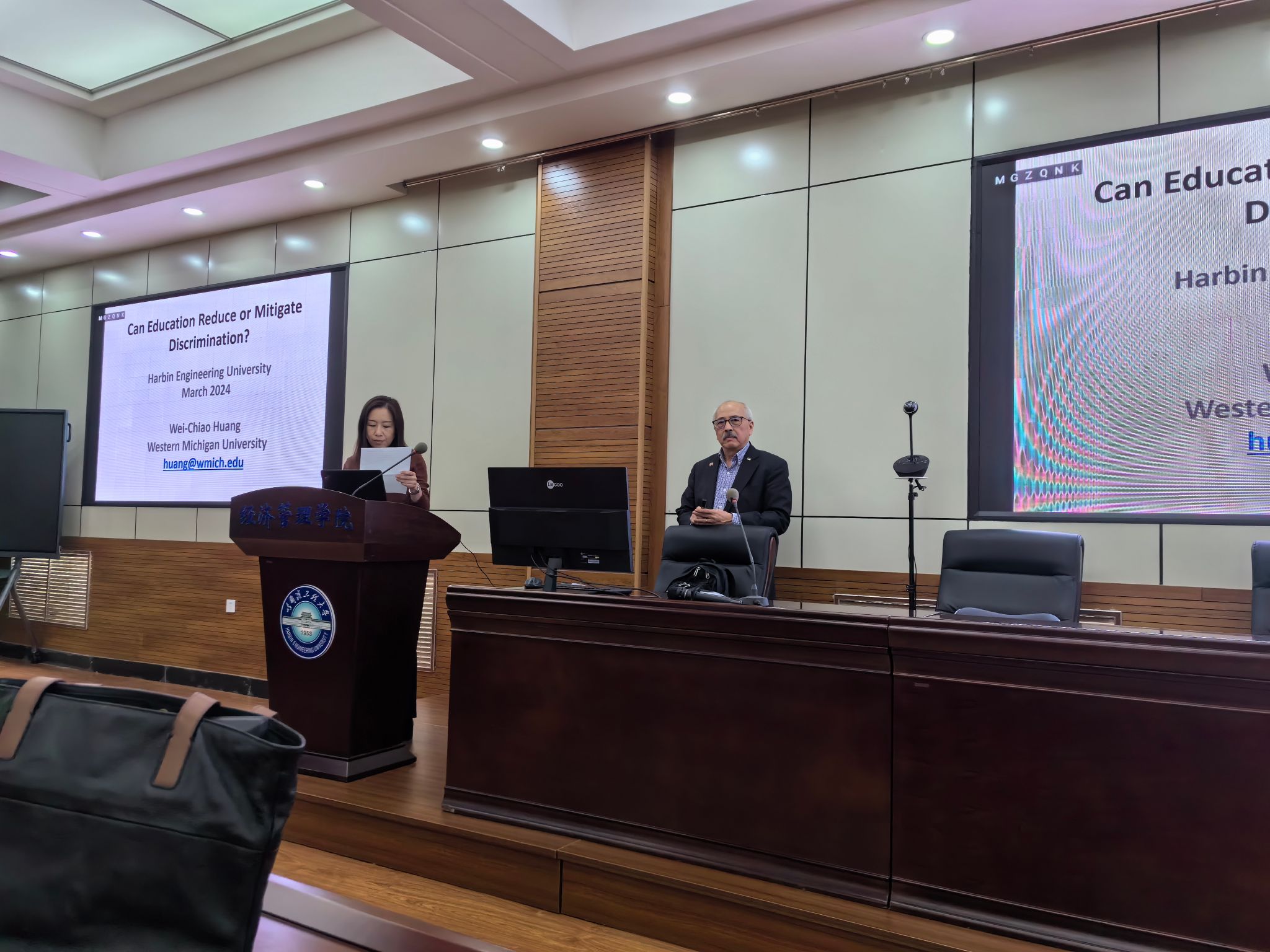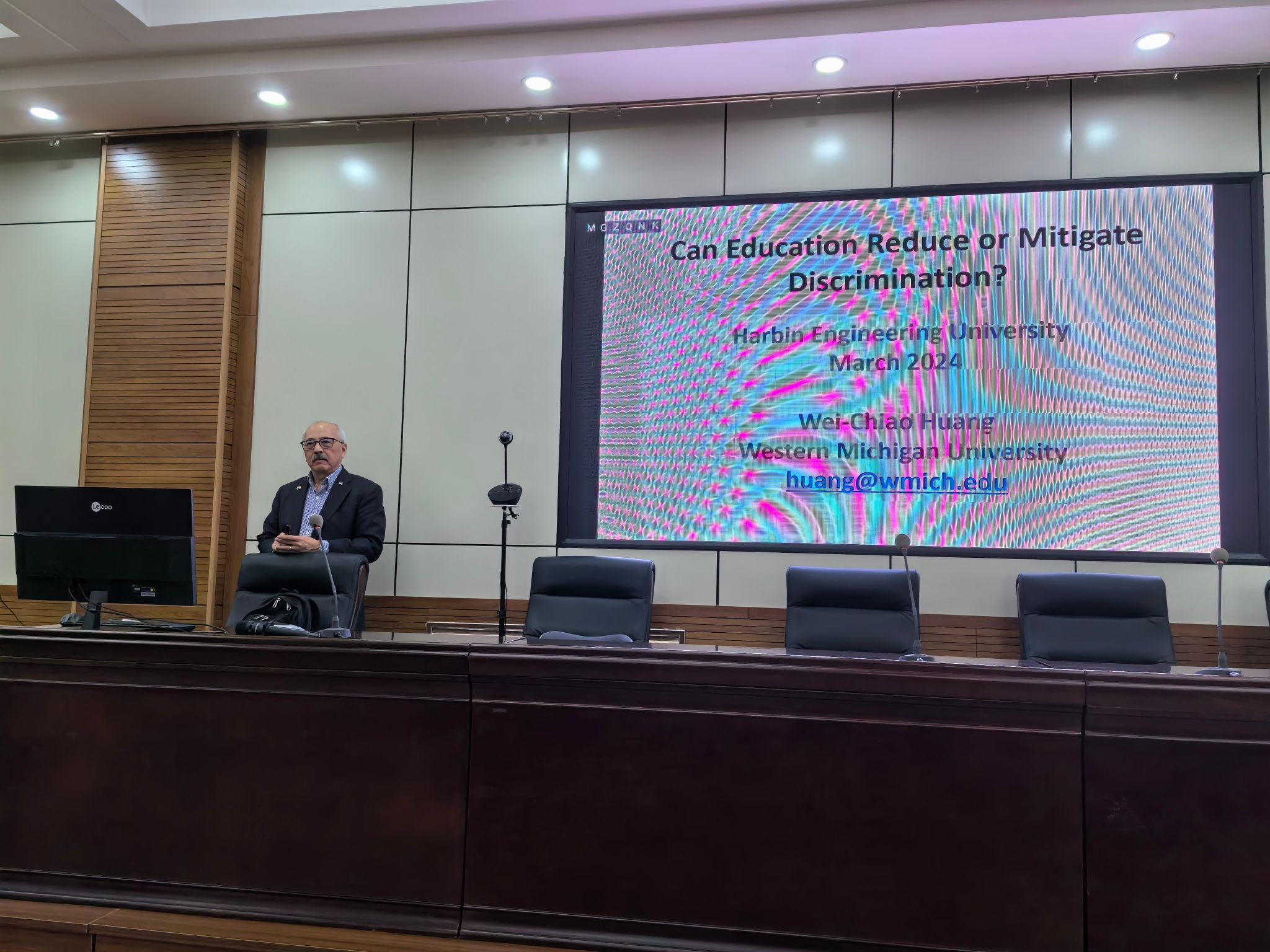 黄教授Wei-chiao Huang教授抛出劳动歧视这一具有普遍性社会问题,认为教育可以向雇主发出员工未被观察到的能力信号,从而减轻歧视,以多个案例的形式提出高等教育能够减轻或缓和劳动歧视的理论假设,并使用美国的博士学位获得者调查数据(SDR)从性别、国籍、身体缺陷等方面分析了劳动歧视现象。研究得出结论:博士教育可以减少对残疾和外籍人的歧视,但不能减少对性别的歧视;尽管博士教育能够消除一部分劳动歧视,但偏见是长期的社会和文化影响造成的,现阶段无法得到根除,由此也呼吁无论是雇主还是员工都应该平等地对待他人,这样才能更好地消除劳动歧视。这次精彩的学术讲座不仅让在座的师生领略了如何严谨地做学术,更使得同学们从专业角度学会正确看待劳动歧视这一问题。