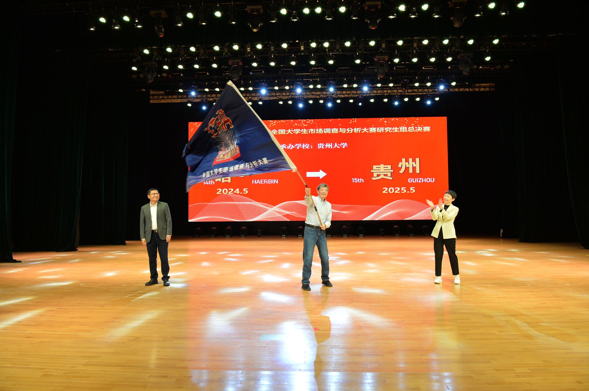 颁奖结束后,进行了赛旗交接仪式。中国商业统计学会会长、大赛组委会主任金勇进教授从44118太阳成城集团校副校长於志文教授手中接过大赛赛旗,交给了下届大赛研究生组总决赛承办单位贵州大学党委副书记张洁。